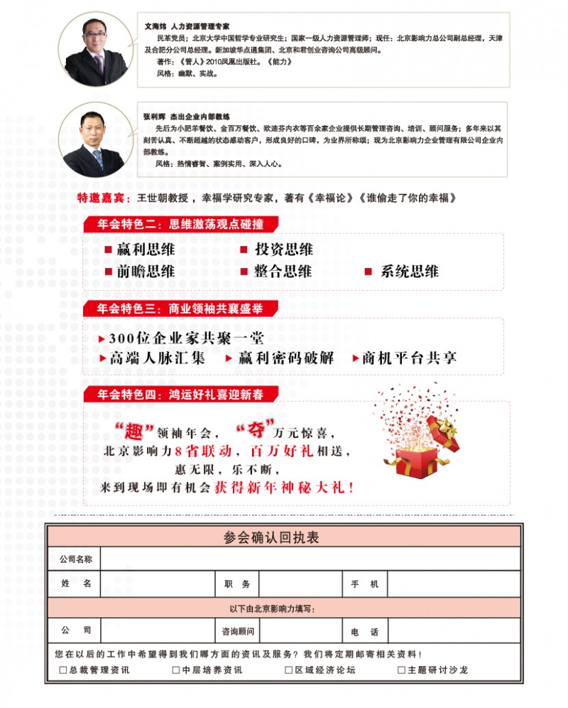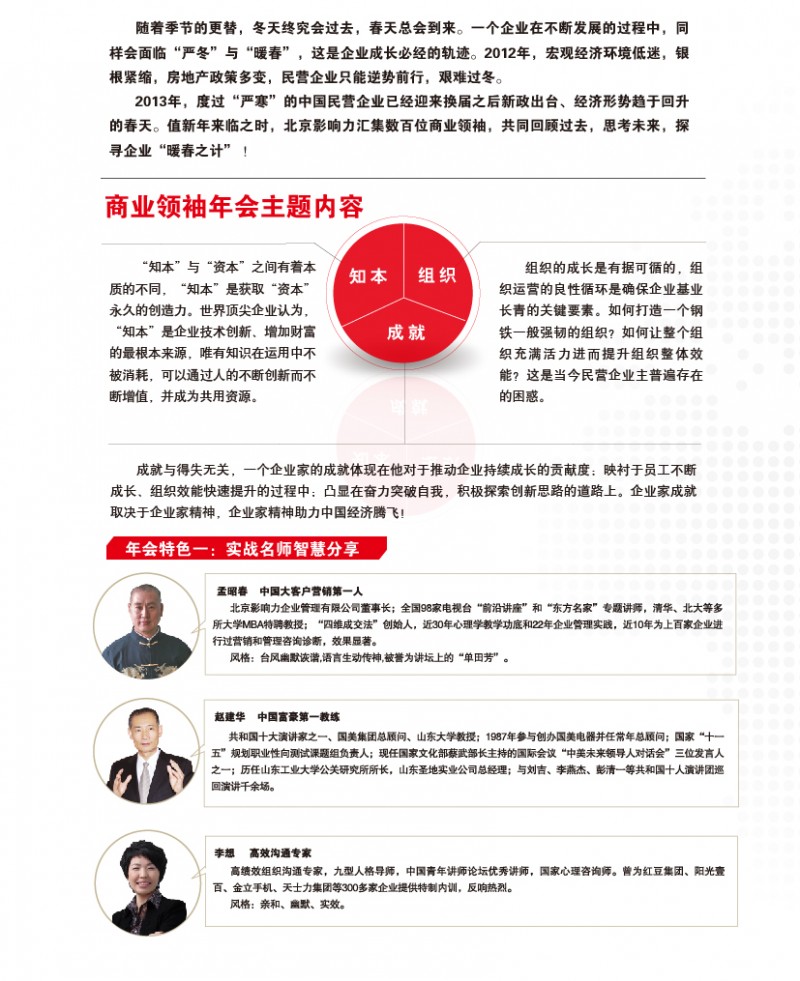 北京影響力在2013年到來(lái)之時(shí),傾公司之力舉辦中國(guó)商業(yè)領(lǐng)袖年會(huì),主題《知本、組織、成就》,幫助所有的企業(yè)家更好的做好2012年的總結(jié),從容的迎接2013年的到來(lái)。2012年很多的民營(yíng)企業(yè)老板反應(yīng)企業(yè)的發(fā)展遇到了大環(huán)境及內(nèi)部管理上的瓶頸,2013年到來(lái)了,經(jīng)濟(jì)形勢(shì)有所好轉(zhuǎn),企業(yè)家如何做好充分的準(zhǔn)備,讓企業(yè)的發(fā)展更上一個(gè)臺(tái)階。