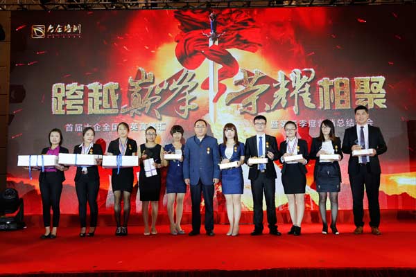 19日上午的會(huì)議篇分為“變革2015榮譽(yù)滿載”、“ 變革2015持續(xù)追擊”兩大環(huán)節(jié)。各家公司“閱兵式”的入場(chǎng)儀式,拉開了“首屆大企全國精英高峰匯”會(huì)議篇的帷幕。大企董事長(zhǎng)孟昭春、執(zhí)行董事徐友富、總裁劉永忠分別作了重要發(fā)言,對(duì)大企的過去和未來進(jìn)行了深度剖析。尤其孟董事長(zhǎng)親筆書寫的“最強(qiáng)東道主”的牌匾和各公司老總為本次高峰匯的東道主——上海分公司獻(xiàn)禮的環(huán)節(jié)也是會(huì)議篇的亮點(diǎn)之一。當(dāng)“大企能量先鋒獎(jiǎng)”、“大企新銳五強(qiáng)獎(jiǎng)”、“大企菁英獎(jiǎng)”、“大企專業(yè)突出獎(jiǎng)”、“大企績(jī)優(yōu)戰(zhàn)隊(duì)獎(jiǎng)”、“大企最具潛力經(jīng)理人獎(jiǎng)”等獎(jiǎng)項(xiàng)一一被揭曉的時(shí)候,精英們激動(dòng)不已,皆為第三季度獲獎(jiǎng)的各公司伙伴鼓掌喝彩。 尤其“巔峰對(duì)決”男神戰(zhàn)隊(duì)獲勝團(tuán)隊(duì)的頒獎(jiǎng)更令人熱血沸騰。賞罰分明,中場(chǎng)休息后,緊接著進(jìn)行的是“巔峰對(duì)決”男神戰(zhàn)隊(duì)最后一名的懲罰——合肥、天津分公司團(tuán)隊(duì)成員在指壓板上舞出“大企風(fēng)采”。優(yōu)秀的大企人帶著夢(mèng)想在拼,帶著青春在奔,這一刻走上舞臺(tái)的帶著笑的淚,難能可貴!